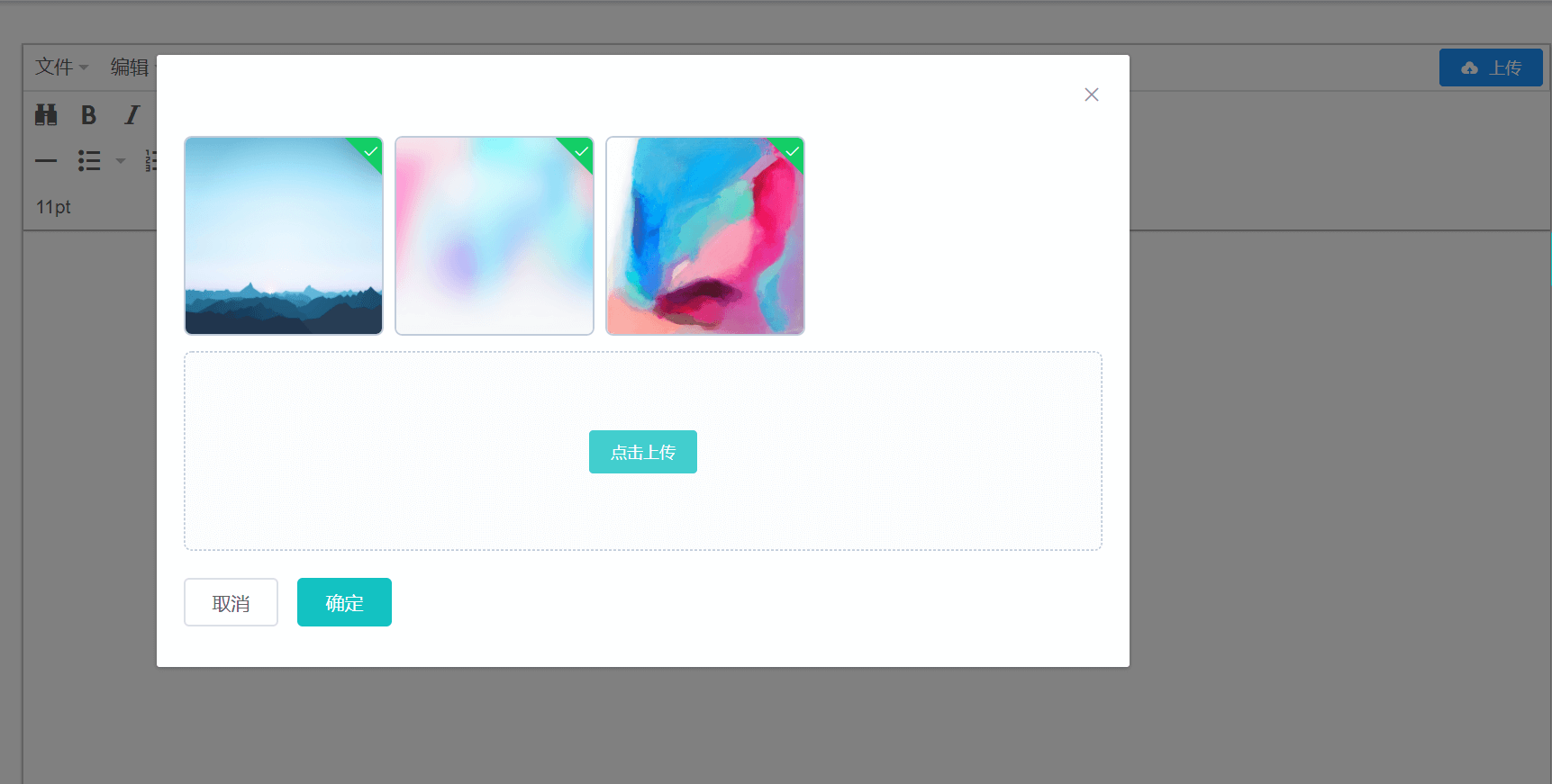 | <template> <div class="upload-container"> <el-button :style="{background:color,borderColor:color}" icon="el-icon-upload" size="mini" type="primary" @click=" dialogVisible=true"> 上传 </el-button> <el-dialog :visible.sync="dialogVisible"> <el-upload :multiple="true" :file-list="fileList" :show-file-list="true" :on-remove="handleRemove" :before-upload="beforeUpload" :http-request="uploadImage" action="#" class="editor-slide-upload" list-type="picture-card" > <el-button size="small" type="primary"> 点击上传 </el-button> </el-upload> <el-button @click="dialogVisible = false"> 取消 </el-button> <el-button type="primary" @click="handleSubmit"> 确定 </el-button> </el-dialog> </div> </template>